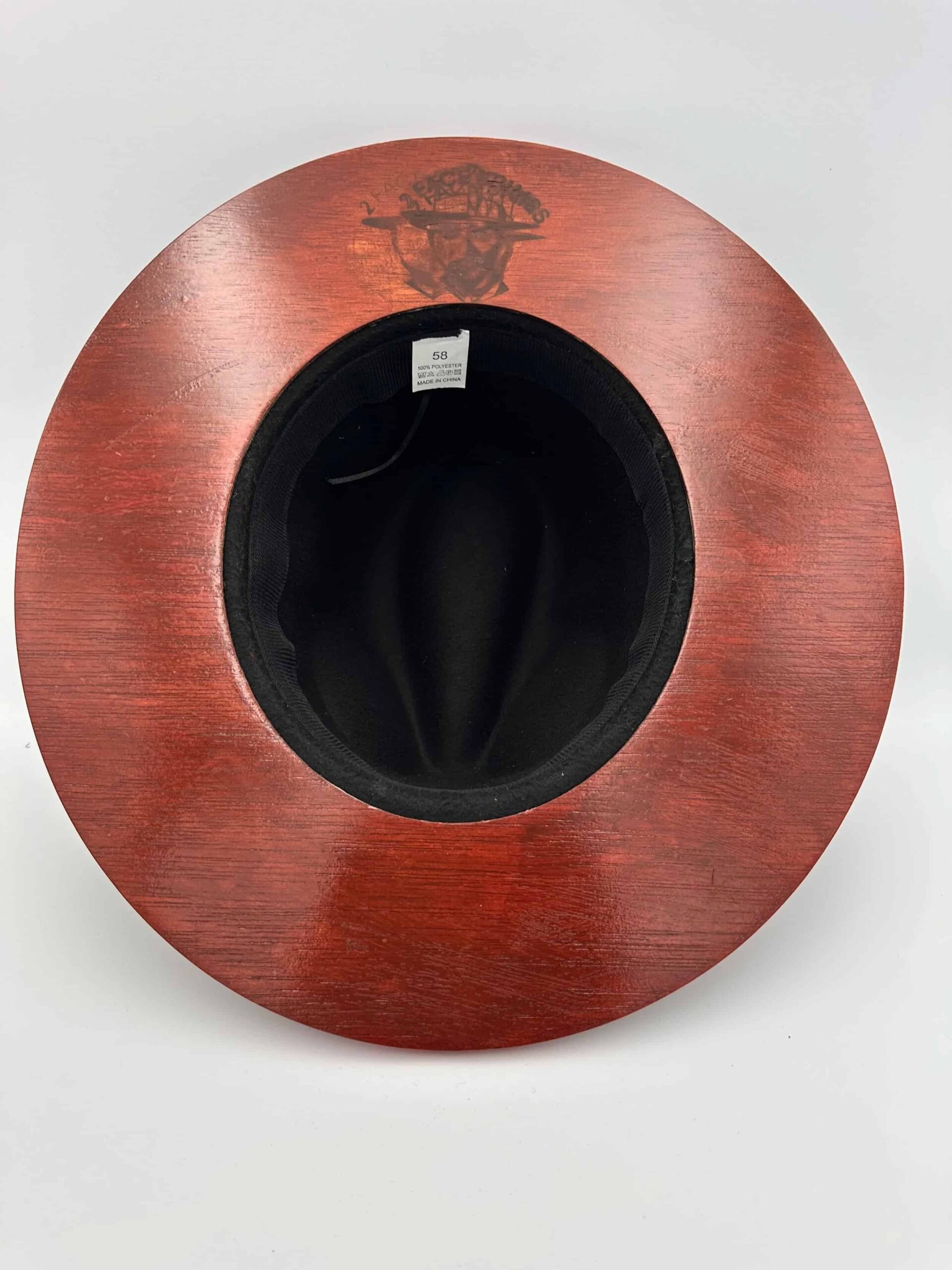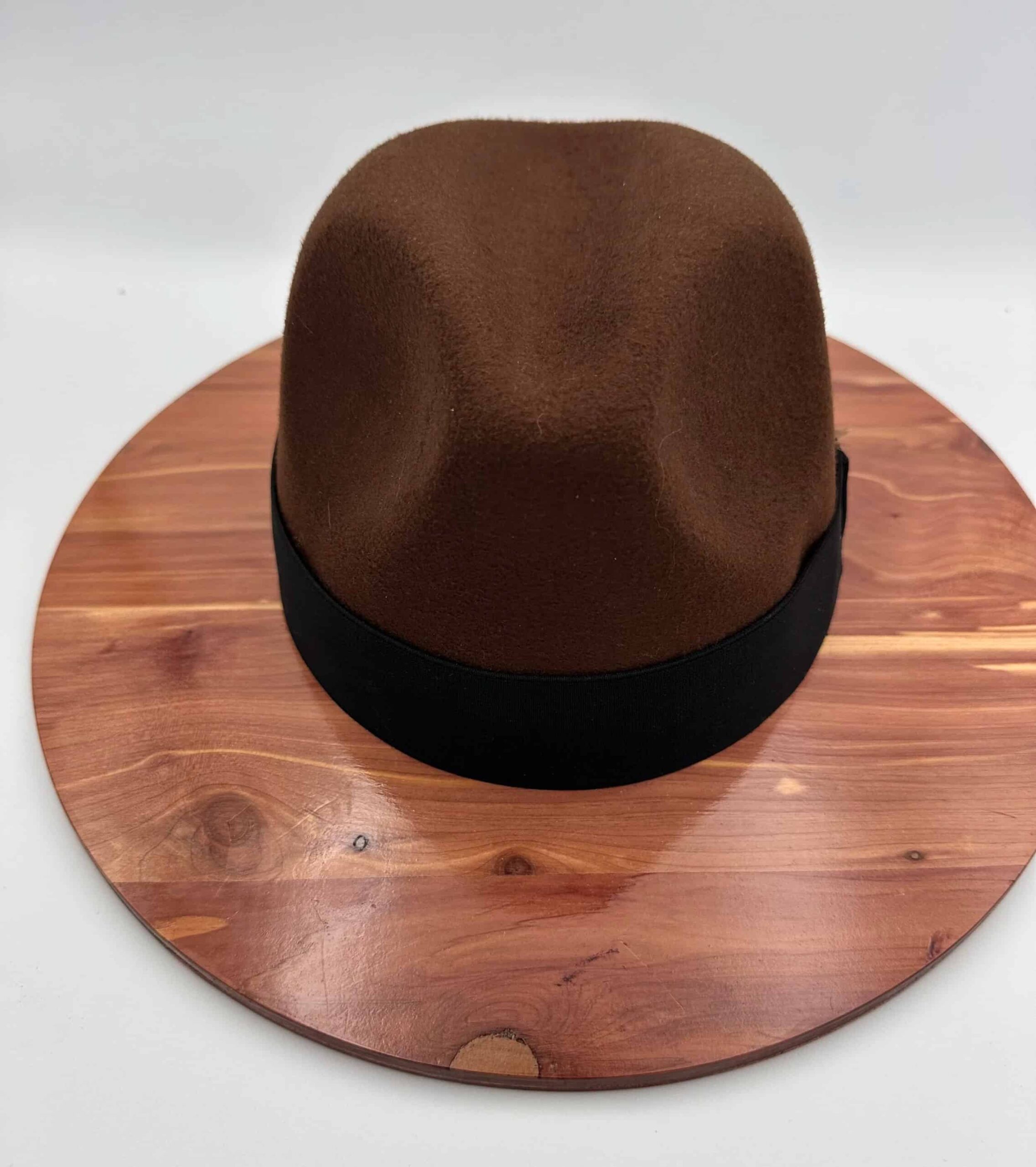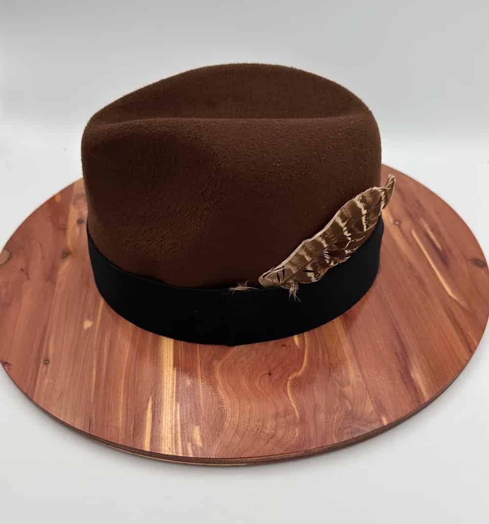 Classic craftsmanship meets natural elegance in this brown wool felt hat, accented with a handcrafted cedar wooden brim. The warm, earthy tone of the premium wool felt crown is perfectly complemented by the rich grain and golden-red hues of the cedar wood, making this piece a timeless expression of refined style. Meticulously crafted this hat is ideal for those who appreciate quality, originality, and artisanal design.
